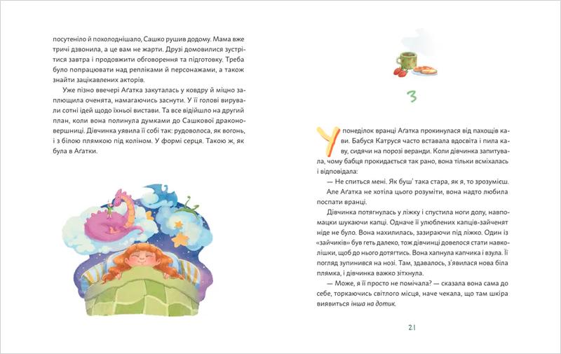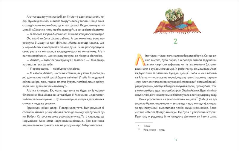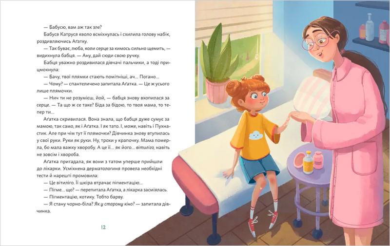 «На сонячному світлі виразно виднілися білі плямки. Вони всіяли її кисті та пальчики. Як же це назвала лікарка? — Аґатка ніяк не могла пригадати дивного слова на “в”…» .