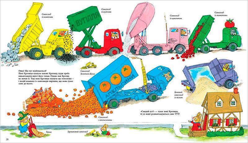 Тут є все: від буряковоза до крокодиломобіля, від гарбузомобіля до свинкофургона. Крім веселих історій, книжка розвиває увагу дитини та знайомить із різними професіями.