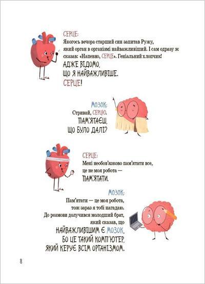 Будьмо знайомі! Ми — твої внутрішні органи. Ми живемо у твоєму тілі, працюємо і дбаємо про те, щоб твій організм працював злагоджено вдень та вночі! А хто з нас НАЙВАЖЛИВІШИЙ? Мозок? Легені? А може, серце? Ти дізнаєшся це, коли прочитаєш книжку. А ще точно дізнаєшся: - як називаються органи тіла; - як вони працюють; - за що кожен з них відповідає; - що відбувається, коли вони з якихось причин працюють не так, як треба. Тож не марнуй часу: розгортай книжку і дізнавайся відповідь на запитання і наші таємниці!