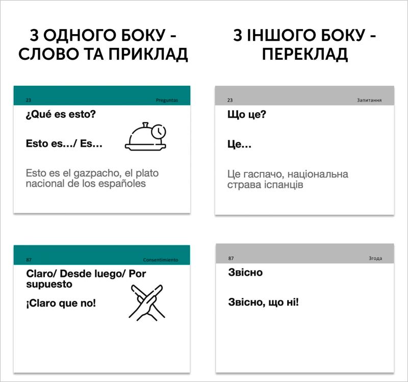 Набір «Іспанська на щодень» (рівень А1-А2) — картки із фразами на щодень для підвищення рівня володіння іспанською. Для тих, хто починає вчити іспанську, але вже хоче вміти вести елементарну розмову. 105 карток із запитаннями та популярними виразами допоможуть почуватися впевненіше під час буденної розмови та подорожі за кордон. До кожної картки набору є аудіосупровід, який додатково навчить розбиратися з правильною вимовою та сприйманням слів на слух.