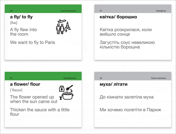 Омоніми — це слова з однаковою вимовою, написанням або і тим, і іншим, але з різними значеннями. Картки допоможуть відчути тонкі відмінності між словами, що звучать або пишуться однаково, але мають інший сенс. Аудіосупровід до кожної картки допоможе опанувати правильну вимову.