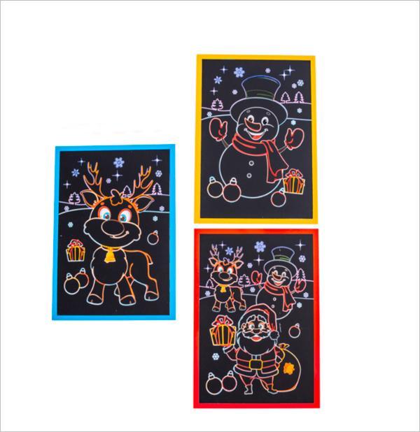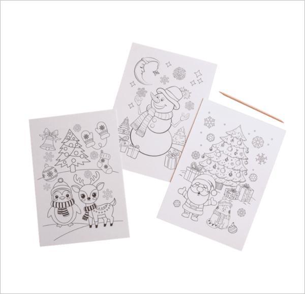 У комплекті 6 в 1: 3 яскраві кольорові гравюри та 3 чорно-білі розмальовки з казковими новорічними героями – оленятком, Святим Миколаєм, сніговичком, пінгвінчиком і котиком біля ялинки. До складу набору також входить якісний дерев’яний стилус, за допомогою якого можна вицарапувати картинки.