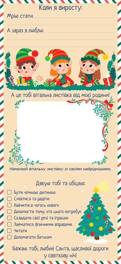 «Лист Санта Клаусу» — особливий лист для особливих побажань. У ньому малюк зможе поділитися своїми мріями та розповісти про добрі вчинки. Набір містить конверт, листівку та буклет із завданнями. Виконуючи їх, дитина може продумати, які подарунки хоче отримати, і намітити добрі справи на новий рік. Це чудовий спосіб навчитися виражати вдячність та вірити у диво.