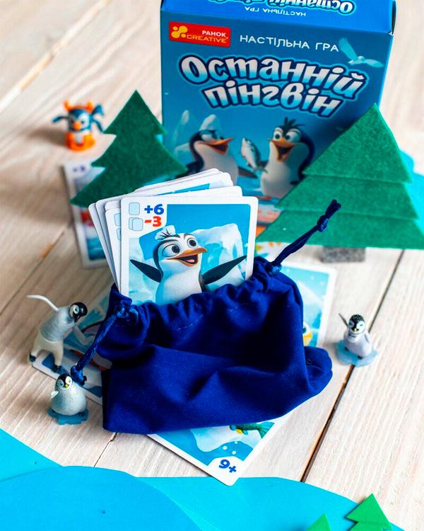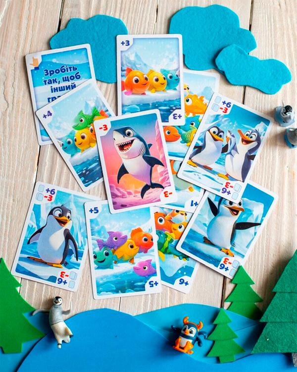 У наборі: 24 картки (7 з рибою, 5 з пінгвінами, 9 із завданнями, 3 хижаки), велюровий мішечок для зберігання карток.