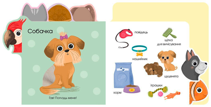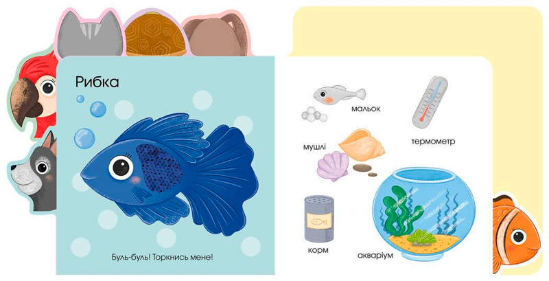 Ця унікальна тактильна книжка познайомить малюка з улюбленими домашніми тваринами: котиком, песиком, черепашкою, рибкою та папугою.