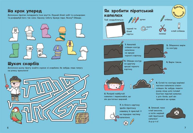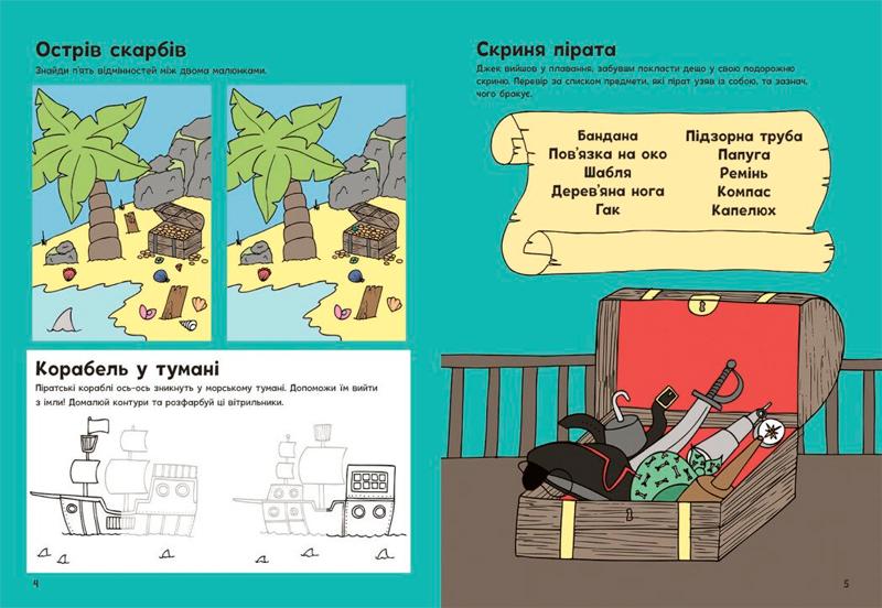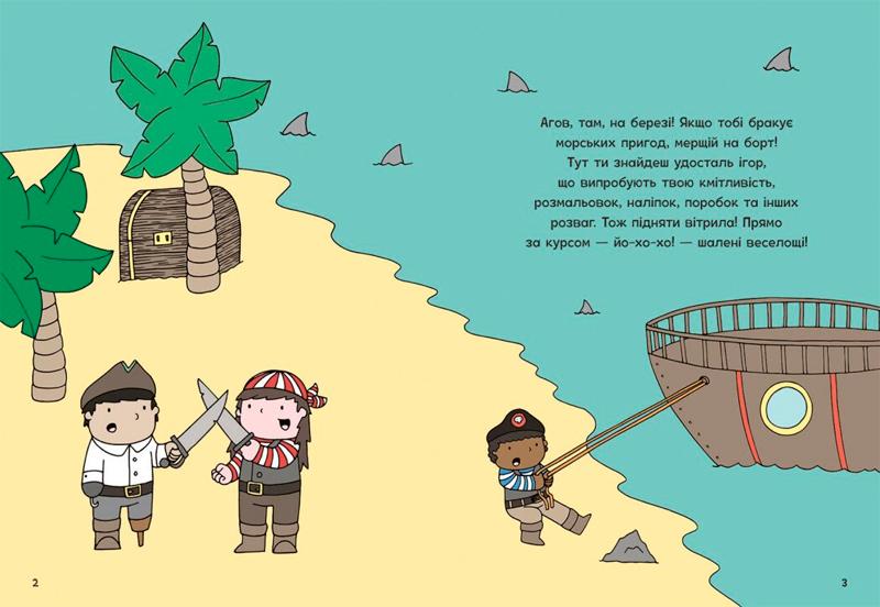 Тут для дітлахів є безліч пізнавальних скарбів: головоломки, лабіринти, розмальовки, вигадливі задачі й приклади... А також творчі завдання й саморобки. І все — про піратів і їхні пригоди! Дитина шукатиме відмінності між островами, розшифровуватиме таємні послання і навіть змайструє піратський корабель.