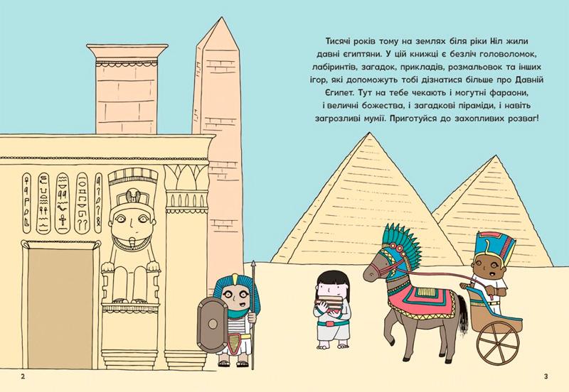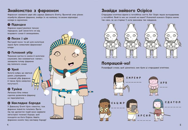 Яка піраміда найвища? Обчисли вирази — і дізнайся! Який одяг носили фараони? Розплутай доріжки, щоб побачити! А як зробити мумію? Просто повторюй інструкцію крок за кроком! А наліпки зроблять знайомство з давніми єгиптянами ще яскравішим. Гайда!