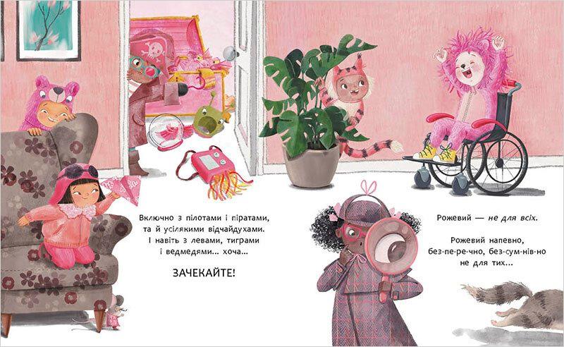 Кілька дітлахів залишились удома в дощовий день, їм сумно... аж раптом вони знаходять рожеву скриню зі скарбами! Це перетворює їхній сірий день на свято рожевого кольору! Рожевий — для ґудзиків і шкарпеток, для художників й астронавтів, прибульців і танцюристів, для драконів і пожежників! Лише похмурий кіт тримається осторонь — він полюбляє зелені краватки-метелики.