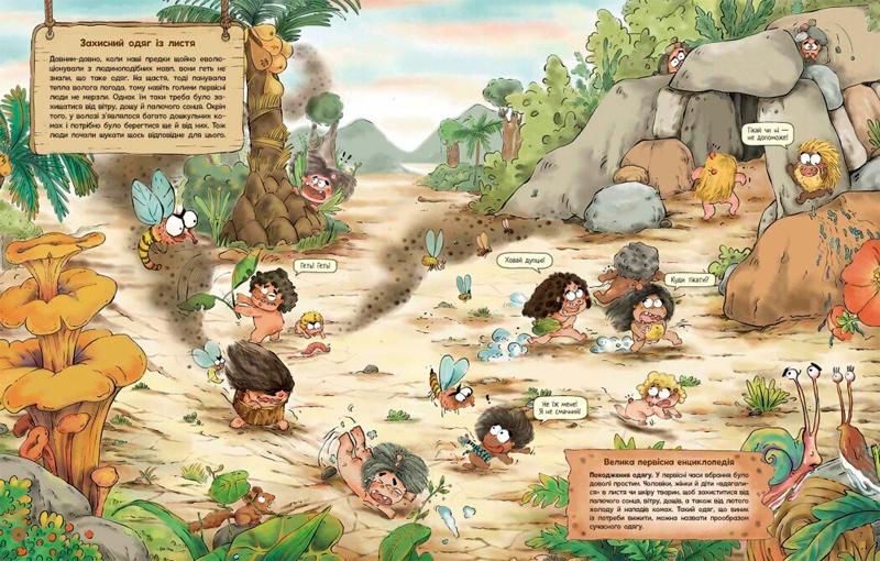 Із цим коміксом маленькі читачі проведуть цілий день тут із нашими пращурами. А звідти дізнаються, як люди створювали найперший одяг зі шкур тварин та кори дерев, щоб захиститися від холоду, спеки та комах. Згодом — чому наші предки почали вбиратися гарніше й навіть додавати прикраси.