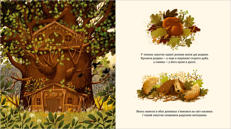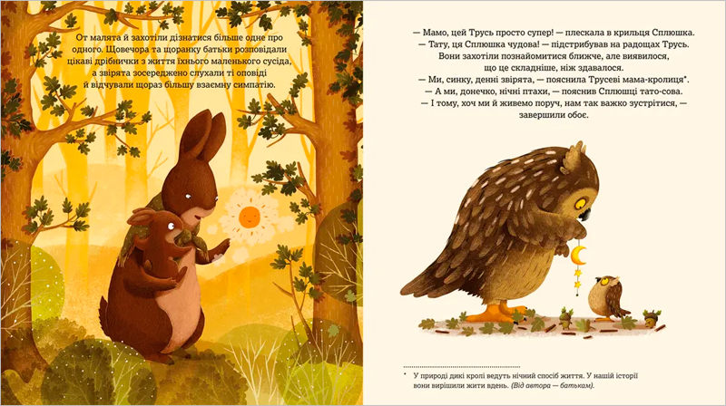 У підніжжі старого дуба живе кроляча родина, а високо в його кроні, у дуплі-сховку — совина. І хоча кролі й сови мешкають поруч, зустрітися їм непросто. Адже коли сонячного дня кроленя Трусь стрибає серед трав, маленька сова Сплюшка солодко спить. А коли вона випростує крила, щоб політати у сяйві місяця, Трусь якраз засинає. Минають дні та ночі, а малята майже нічого не знають одне про одного. Аж до миті, коли вперше побачаться…