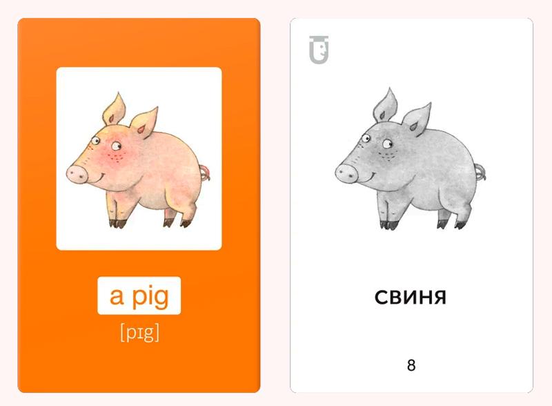 З одного боку – ілюстрація, слово та транскрипція, а з іншого – переклад. На звороті пакування є Qr-код із аудіосупроводом. Усе, щоб малюки звикали до правильної вимови одразу. А яскраві ілюстрації допомагають візуально запамʼятовувати англійські слова.