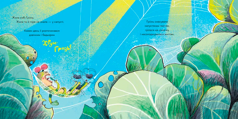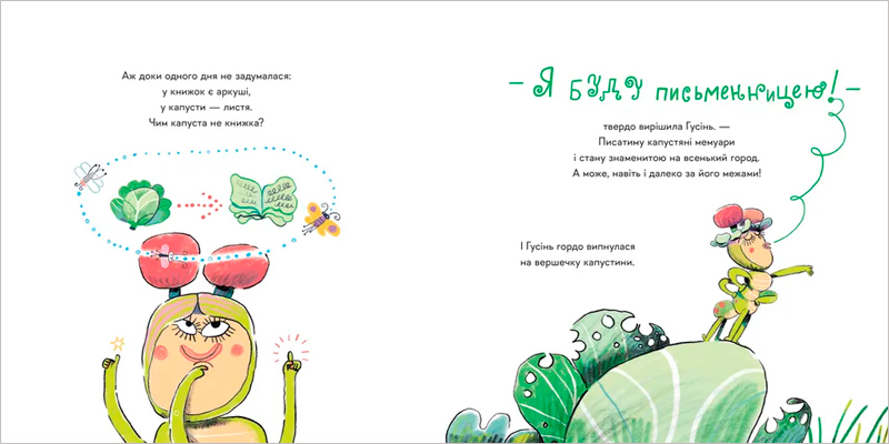 Зелена-зеленісінька Гусінь, та сама, що живе у капусті, надумала раптом стати письменницею. Хочу, каже, писати капустяні мемуари й прославитися на всенький городець! Гайда разом із Гусінню ловити Музу за хвоста, шукати пухнасте письменницьке перо, припасовувати суріпку замість письменницького капелюшка!