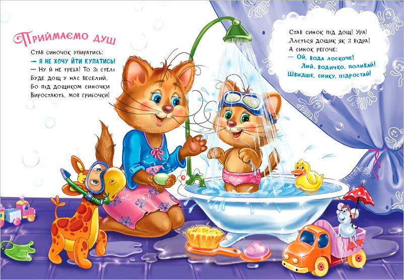 Котик-чепурун допоможе маляті подружитися з водичкою, перетворить звичайний душ на чарівний дощ, пояснить, де живе хусточка! А вивчивши віршовані рядки-лічилочки, малюк швиденько вмиється!
