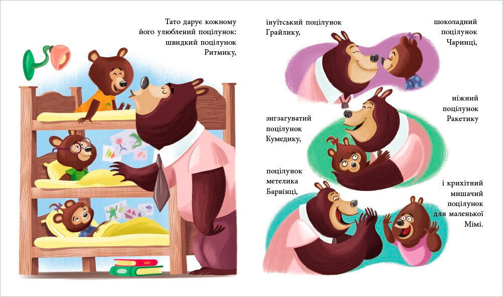 Вони разом читають книжки, граються і жартують. І ось пора лягати спати — татусь Цілуйко вкладає своїх дітлахів у ліжка, дарує кожному особливий поцілунок і бажає доброї ночі.